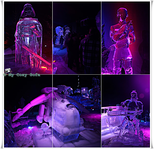 Žymiai įdomiau buvo per skulptūrų ypatumus atsiskleidusi ledo skulptorių meistrystė. Šias skulptūras iš 500 tonų ledo net keturias savaites kūrė trisdešimt meistrų iš skirtingų šalių. Kai kurios jų buvo tikrai pribloškiančios savo dydžiu (pvz., siekiančios net 6 metrus) ar (ir) detalumu. Labai tikroviškai atrodė Džiabos už grandinės laikančio Lėją kompozicija, o mano didelės simpatijos sulaukė baltasis imperijos karys.
